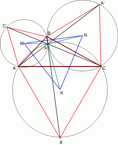 Проведем отрезки AA’, BB’, CC’ и обратим внимание на равенство треугольников ABA’ и CBC’ по двум сторонам и углу между ними и на тот факт, что они легко превращаются друг в друга поворотом на 60° вокруг точки B. Таким образом, угол между CC’ и AA’ равен 60°. Аналогично можно показать, что углы BFA’, A’FC, CFB’, B’FA также равны 60°. Тогда угол AFB равен 120° и опирается на AB со стороны, обратной углу AC’B, равному 60°, следовательно четырехугольник AC’BF вписанный. Соответственно, точка F лежит и на описанных окружностях треугольников ABC’, BCA’ и ACB’.