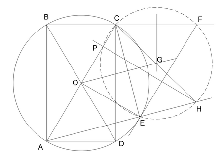 Строим срединный перпендикуляр к CF, затем через точку O перпендикуляр к СE. На их пересечении отмечаем центр G описанной окружности треугольника СEF. Проводим АЕ. Проводиm CG до пересечения с продолжением AE в точке H.