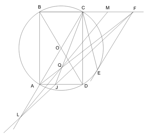 Можно было бы выбрать сразу трапецию ACFD, но в нашем примере AD почти || FD, поэтому возьмем на AD произвольную точку J и построим трапецию ACFJ. Найдем точку пересечения продолжений ее боковых сторон L и точку пересечения диагоналей Q. Проведем LQ до пересечения с CF в точке M, тогда M – середина CF. |