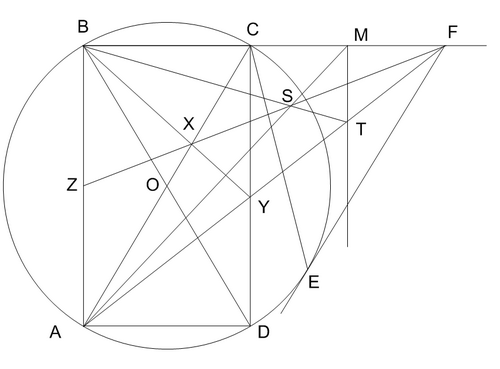 Пояснение 2. Для построения перпендикуляра к СF в точке M проведем через точку M прямую, параллельную CD. Для этого найдем сначала середину отрезка AB: проведем AF, отметим точку Y пересечения AF и CD. Проведем диагонали трапеции ABCY и отметим точку их пересечения X. Отметим точку Z пересечения FX и AB. Согласно упомянутой в Пояснении 1 теореме Z будет серединой AB. Теперь рассматриваем трапецию, одним основанием которой служит AB, а другое проходит через M, и нам нужно найти второй конец этого основания. Для этого проводим диагональ искомой трапеции AM и на ее пересечении с FZ отмечаем точку S. Вторую диагональ трапеции проводим через B и S и на пересечении BS и AF находим искомую вершину трапеции T.