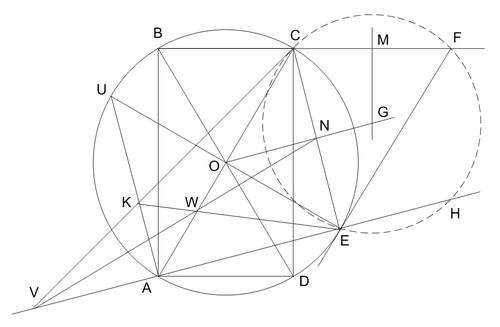 Пояснение 3. Пусть G - искомый центр описанной окружности треугольника ECF. Для построения срединного перпендикуляра к CE заметим предварительно, что CE является хордой данной окружности с центром O, следовательно, треугольник COE равнобедренный, и его высота ON будет искомым срединным перпендикуляром. Для поиска точки N Отметим второй конец U диаметра EO и соединим его с A. AU || CE. Выберем на AU произвольную точку K и, построив точку W пересечения диагоналей трапеции AKCE и точку пересечения ее боковых сторон V, на пересечении VW и CE найдем точку N. Проводим ON. |