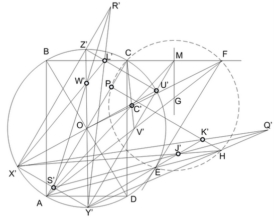 Пояснение 4. Для построения перпендикуляра к AC через точку H нам необходимо сначала построить хорду окружности, параллельную искомому перпендикуляру, а для этого нужно построить секущую окружности, отличную от диаметра, параллельную AC. Выберем отрезок AC в качестве основания трапеции с известной серединой в точке O. Пусть F будет пересечением продолжений ее сторон, а M - одной из вершин второго основания. Проведем AF, AM и OF. Точка C’ пересечения OF и AM является точкой пересечения диагоналей трапеции. Проводим CC’ до пересечения с AF в точке V’ - второй вершине основания MV’ трапеции ACMV’. Проводим секущую MV’ и отмечаем точки ее пересечения с окружностью U’ и Y’. Через O проводим диаметры U’X’ и Y’Z’. Тогда X’Y’ и U’Z’ параллельны искомому отрезку HP. Найдем точку S’ - середину X’Y’ с помощью трапеции X’Y’Z’L’, где L’ - произвольная точка на отрезке U’Z’. Проведем теперь Y’H и на его продолжении отметим произвольную точку Q’, которую используем как пересечение продолжений сторон трапеции с основанием X’Y’. Проведем X’Q’. Проведем S’Q’ и X’H и через точку их пересечения J’ проведем Y’J’. На пересечении Y’J’ и X’Q’ найдем вторую вершину K’ основания HK’ трапеции X’K’HY’. Наконец, проводим HK’ до пересечения с AC в искомой точке P. |