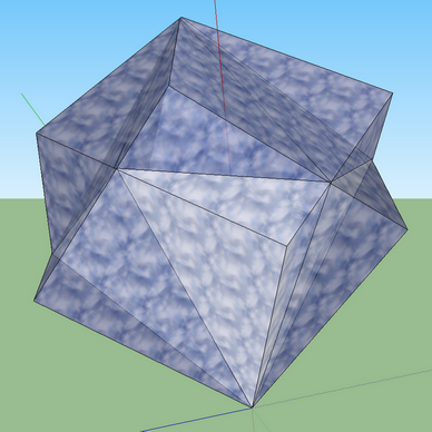 Для начала попробуем представить, как выглядит описанная конструкция. Очень похоже, что общая часть двух кубов представляет собой 12-гранник, все грани треугольники - основания пирамид, отрезанных кубами друг от друга. Допустим, что мы обратно совместили оба куба, а затем начали поворачивать их вокруг главной диагонали в противоположные стороны синхронно. Тогда уходящие вправо части куба симметричны уходящим влево относительно неподвижной плоскости симметрии, проходящей через главную диагональ кубов. Таких плоскостей симетрии возникает 12, как видно на следующем рисунке (6 красных и 6 зеленых осевых линий на горизонтальной проекции). Вследствие этой симметрии при любом относительном угле поворота ребра кубов, не пересекающие главную диагональ, будут пересекать друг друга. Следовательно, можно считать доказанным, что общая часть двух кубов ограничена 12-ю равными треугольниками, общая площадь которых составит общую площадь поверхности фигуры, а общий объем двух кубов за вычетом объема 12-ти треугольных пирамид, отсекаемых кубами друг от друга, составит объем общей части кубов. Теперь можно перейти к вычислениям. |