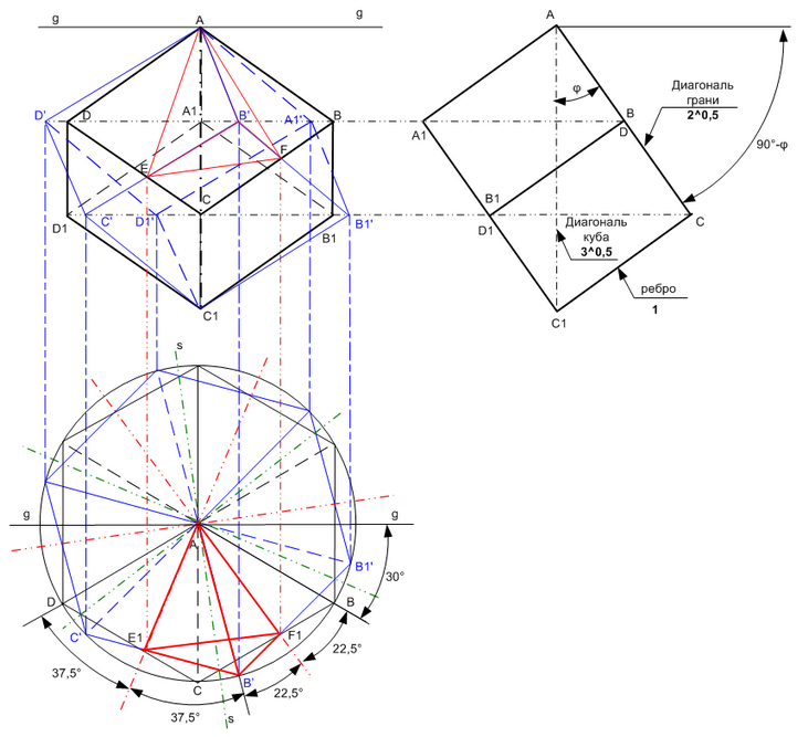 Пусть угол поворота куба β будет произвольным 0°<β<60°. В правильном треугольнике ACB угол AF1B=180°-60°-β/2=120°-β/2. Горизонтальную проекцию чевианы AF1 найдем по теореме синусов: sin60°/AF1=sin(120°-β/2)/AB AF1=AB*sin60°/(120°-β/2) Аналогично находим горизонтальную проекцию чевианы AE1 треугольника DAC: sin60°/AE1=sin(180°-60°-(60°-β/2))/AD AE1=AD*sin60°/sin(60°+β/2) Обратим внимание на то, что AB=AD, а sin(60°+β/2)= =sin(90°-30°+β/2)=sin(90°+30°-β/2)=sin(120°-β/2) Отсюда следует, что AE1=AF1= =((2/3)^0,5*sin60°/sin(60°+β/2) Это видно также в том, что треугольники E1F1C (черный куб) и E1F1B’ (синий куб) имеют общее основание и симметричны относительно прямой ss. Кроме того, в горизонтальной проекции угол E1AF1=120°-β/2-(60°-β/2)=60°, значит, треугольник E1AF1 равносторонний. Площадь треугольника AF1E1 равна: S1=½ AE1*AF1*sin60°= =½(AB1*sin60°/sin(60°+β/2))^2*sin60°= =½ * 2/3 * ¾ * 3^0,5/2 / (sin(60°+β/2))^2= =1/8*3^0,5/(sin(60°+β/2))^2 Истинная площадь треугольника AEF после поворота грани ABCD вокруг прямой gg на (90°-φ) до совпадения этой грани с горизонтальной плоскостью: Saef=S1/cos(90°-φ)=S1*3^0,5= =(3/8)/(sin(60°+β/2))^2 Соответственно, площадь поверхности фигуры, оказавшейся в пересечении кубов А и Б: S=12*Saef=(9/2)/(sin(60°+β/2))^2 Поскольку (sin(60°+β/2))^2 полого возрастает на участке 0°<β/2<30°, легко определить, что минимальная площадь общей части двух кубов будет наблюдаться при β/2=30°, т.е. при относительном повороте на 60°, и составит S=12*Saef= 9/2 = 4,5 а максимальная, соответственно, при β=0°: S=12*Saef=(9/2)/(sin(60°)^2=6 |
