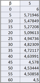 Составим таблицу искомой площади в зависимости от угла поворота β (с шагом 5°). Проверим «вручную» для угла β=45°: S=12*Saef=(9/2)/(sin(60°+β/2))^2=(9/2)/(sin82,5°)^2= =(9/2)/(1/8*(4+2^0,5*(1+3^0,5))) ≈ 4,578 Для справки: sin22,5°=((1-cos45°)/2)^0,5=(2-2^0,5)^0,5/2 cos22,5°=((1+cos45°)/2)^0,5=(2+2^0,5)^0,5/2 sin82,5°=sin(60°+22,5°)=sin60°cos22,5+sin22,5°cos6 0°= =3^0,5/2*(2+2^0,5)^0,5/2+(2-2^0,5)^0,5/2*½= =¼*(3^0,5*(2+2^0,5)^0,5+(2-2^0,5)^0,5) (sin82,5°)^2=1/16*(3*(2+2^0,5)+2*3^0,5*2^0,5+2-2^0,5)= =1/16*(6+3*2^0,5+2*3^0,5*2^0,5+2-2^0,5)= =1/16*(8+2*2^0,5+2*3^0,5*2^0,5)= =1/8*(4+2^0,5+3^0,5*2^0,5)= =1/8*(4+2^0,5*(1+3^0,5)) |