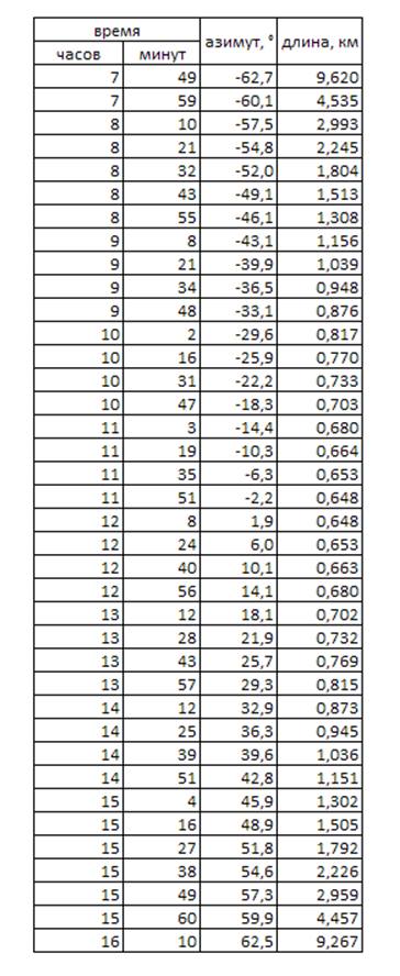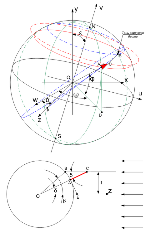 Допустим для простоты, что: 1) время t исчисляется в часах Ч; 2) равноденствие наступает в 12 часов по Ташкентскому времени 22 марта; 3) 22 марта является 81-м днем года; 4) количество часов в году =365,2564*24=8766,154; 8766,154; 5) высота башни h=375 м; 6) радиус Земли 6400 км; 7) координаты телебашни Ташкент φ=41° 19′ N, λ=69° 16′ E; 8) система координат Земли uvw, где ось w перпендикулярна оси вращения Земли, лежит в плоскости эклиптики и отклонена на угол α от радиус-вектора Земли на ее орбите в ее текущей точке, ось v, совпадающая с осью вращения Земли, отклонена от перпендикуляра к плоскости эклиптики на угол ε=23°26′; 9) система координат xyz связана с положением Земли на ее орбите, где ось x касается орбиты, ось y перпендикулярна плоскости эклиптики, ось z направлена к Солнцу; 10) все солнечные лучи, падающие на Землю, параллельны радиус-вектору Земли на её орбите в текущей точке; 11) в полдень 13 ноября Ч=7608. Тогда от начала года до равноденствия пройдет 80*24+12=1932 часа, и текущий угол поворота радиус-вектора Земли от момента равноденствия составит: α=2π*(Ч - 1932) / 8742,154 где Ч – порядковый номер текущего часа, считая с начала года. Текущий угол поворота Земли вокруг своей оси запишем в виде: ω=2π*(Ч - 1932)/23,93447 (Астрономические сутки взяты вместо земных для компенсации поворота земли вокруг своей оси за год за счет вращения вокруг солнца). Рассмотрим декартовы координаты точки A - текущего положения основания башни в системе uvw: u=r*cosφ*sinω v=r*sinφ w=r*cosφ*cosω Определим те же координаты во вспомогательной системе u’yw, полученной поворотом системы uvw на угол ε вокруг оси w: u'=u*cosε + v*sinε y=v*cosε – u*sinε u'= r*cosφ*sinω*cosε + r*sinφ*sinε y= r*sinφ*cosε – r*cosφ*sinω*sinε w=r*cosφ*cosω Теперь определим координаты основания башни в системе xyz поворотом системы u’yw на угол α вокруг оси y: z=w*cosα + u’*sinα x=u’*cosα – w*sinα x=r*(( cosφ*sinω*cosε + sinφ*sinε)*cosα - cosφ*cosω*sinα) y= r*(sinφ*cosε – cosφ*sinω*sinε) z=r*( cosφ*cosω + (cosφ*sinω*cosε + sinφ*sinε)*cosα) Найдем угол δ между радиус-вектором основания башни и направлением по оси z на Солнце: cosδ=z/r cosδ = cosφ*cosω + (cosφ*sinω*cosε + sinφ*sinε)*cosα Рассмотрим теперь сечение AOZ Земли, содержащее угол δ. Вычислим расстояние c от основания башни до тени верхушки вдоль хорды Земной сферы: f=(r+h)*sinδ sinβ=f/r= (r+h)/r*sinδ длина тени башни как ортодромии (дуги AB окружности большого диаметра Земли): L=r*(β-δ) Определим азимут тени башни как угол между касательной AD к меридиану башни в точке А и касательной АЕ к сфере Земли в точке А, лежащей в плоскости AOZ. Координаты точки Е: x=0 y=0 z=r/cosδ Уравнение прямой AE: (x-xA)/(xE-xA)= (y-yA)/(yE-yA)= (z-zA)/(zE-zA) (x- r*(( cosφ*sinω*cosε + sinφ*sinε)*cosα - cosφ*cosω*sinα)/ (- r*(( cosφ*sinω*cosε + sinφ*sinε)*cosα - cosφ*cosω*sinα))= =(y- r*(sinφ*cosε – cosφ*sinω*sinε))/(- r*(sinφ*cosε – cosφ*sinω*sinε))= =(z- r*( cosφ*cosω + (cosφ*sinω*cosε + sinφ*sinε)*cosα))/ ( r/cosδ - r*( cosφ*cosω + (cosφ*sinω*cosε + sinφ*sinε)*cosα)) Координаты точки D в системе uvw: u=r/cosφ*sinω v=0 w= r/cosφ*cosω во вспомогательной системе u’yw поворотом системы uvw на угол ε вокруг оси w: u'=u*cosε + v*sinε y=v*cosε – u*sinε u’= r/cosφ*sinω*cosε y= - r/cosφ*sinω*sinε w= r/cosφ*cosω в системе xyz поворотом системы u’yw на угол α вокруг оси y: z=w*cosα + u’*sinα x=u’*cosα – w*sinα x= r/cosφ*sinω*cosε*cosα - r/cosφ*cosω*sinα y= - r/cosφ*sinω*sinε z= r/cosφ*cosω*cosα + r/cosφ*sinω*cosε*sinα Уравнение прямой AD: (x-xA)/(xD-xA)= (y-yA)/(yD-yA)= (z-zA)/(zD-zA) (x- r*(( cosφ*sinω*cosε + sinφ*sinε)*cosα - cosφ*cosω*sinα)/ ((r/cosφ*sinω*cosε*cosα - r/cosφ*cosω*sinα) – (r*(( cosφ*sinω*cosε + sinφ*sinε)*cosα - cosφ*cosω*sinα))= =(y - r*(sinφ*cosε – cosφ*sinω*sinε))/ ( - r/cosφ*sinω*sinε - r*(sinφ*cosε – cosφ*sinω*sinε))= =(z - r*( cosφ*cosω + (cosφ*sinω*cosε + sinφ*sinε)*cosα))/ ((r/cosφ*cosω*cosα + r/cosφ*sinω*cosε*sinα) - r*(cosφ*cosω + (cosφ*sinω*cosε + sinφ*sinε)*cosα)) Угол θ между прямыми AD и A
