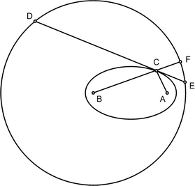Выполним сначала некоторые построения, основанные на свойствах эллипса. Пусть дан эллипс с полуосями а и b. Отметим его фокусы А и B. С центром в фокусе B проведем окружность радиусом 2а. Через фокус В проведем в произвольном направлении прямую. Обозначим точку ее пересечения с эллипсом С, точку ее пересечения с окружностью F. Проведем отрезок СА и хорду окружности DE так, чтобы она касалась эллипса в точке С. Заметим, что углы DCB и FCE равны как накрест лежащие, DCB и ACE равны как углы между касательной и отрезками, соединяющими точку касания с фокусами эллипса, следовательно, углы FCE и ACE равны. Поскольку по определению эллипса |AC| + |BC| = 2a, |AC| = |CF|. Итак, треугольники ACE и FCE равны и симметричны относительно прямой DE. Точки А и F симметричны относительно прямой DE. Вернемся теперь к нашей задаче. Пусть на круглом листе бумаги отмечена произвольная точка А. Согнем лист, совместив точку А с произвольной точкой окружности листа. Зафиксируем линию сгиба, чтобы при разгибании листа на бумаге остался след в виде хорды окружности. Последовательно совмещая точку А с разными точками на окружности и фиксируя линии сгиба, получим семейство хорд, касательных к эллипсу, фокусами которого являются точка А и центр круга. Чем больше сгибов, тем отчетливее виден огибающий семейство касательных эллипс. |