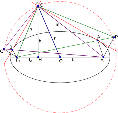 в точках А и В. Отметим точку P, симметричную фокусу F1 относительно прямой AC, и точку Q, симметричную фокусу F2 относительно прямой BC. Обозначим через m отрезок |F1С|=|PC|, через n отрезок |F2С|=|QC|. Поскольку касательная к эллипсу в точке А является биссектрисой угла между продолжением прямой F2A и АF1, точки F2, A и P лежат на одной прямой и |F2P|=2a, аналогично |F1Q|=2a. Треугольники QCF1 и PCF2 равны по трем сторонам и являются прямоугольными. Следовательно, |F1P|2=|F2Q|2=n2+m2=4a2. Проведем высоту |СH|=h треугольника F1CF2, обозначим f1=|F1H|, f2=|F2H|. m2-h2+n2-h2=f12+f22 ; m2+n2=2h2+f12+f22 (I) r2=h2+(c-f1)2=h2+c2-2cf1+f12 r2=h2+(f2-c) 2=h2+c2-2cf22+f22 2r2=2h2+2c2-2c(f1+f2)+f12+f22=2h2-2c2+f12+f22 (II) Вычитая (I) из (II), имеем: 2r2-m2-n2=-2c2 , т.е. r2=(1/2)(m2+n2)-c2 (III) Подставив в (III) n2+m2=4a2 и с2=a2-b2, получим: r2=a2+b2 при любом положении прямого угла ACB, касающегося эллипса обеими сторонами. |
